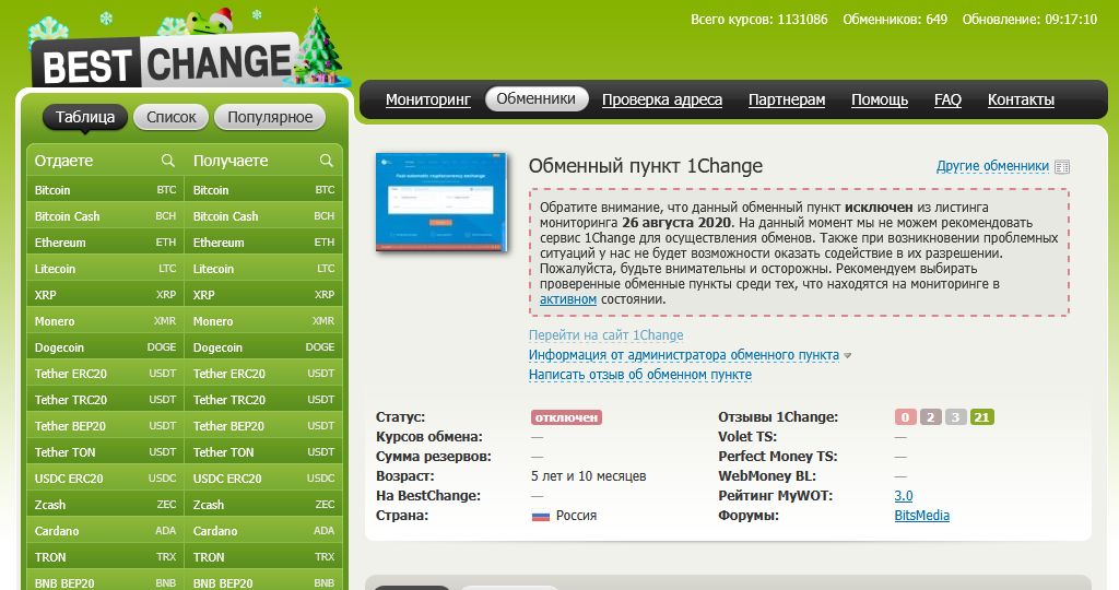 Но в августе 2020 года сервис исключили из списка BestChange без указаний причин. Возможно, обменник останавливал свою деятельность, а может стал предоставлять услуги только действующим клиентам.