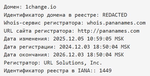 Сотрудники 1Change утверждают, что сайт 1Change io появился 2019 году, но по информации Whois данные не совпадают. Домен 1Change io был зарегистрирован в 2024-м.