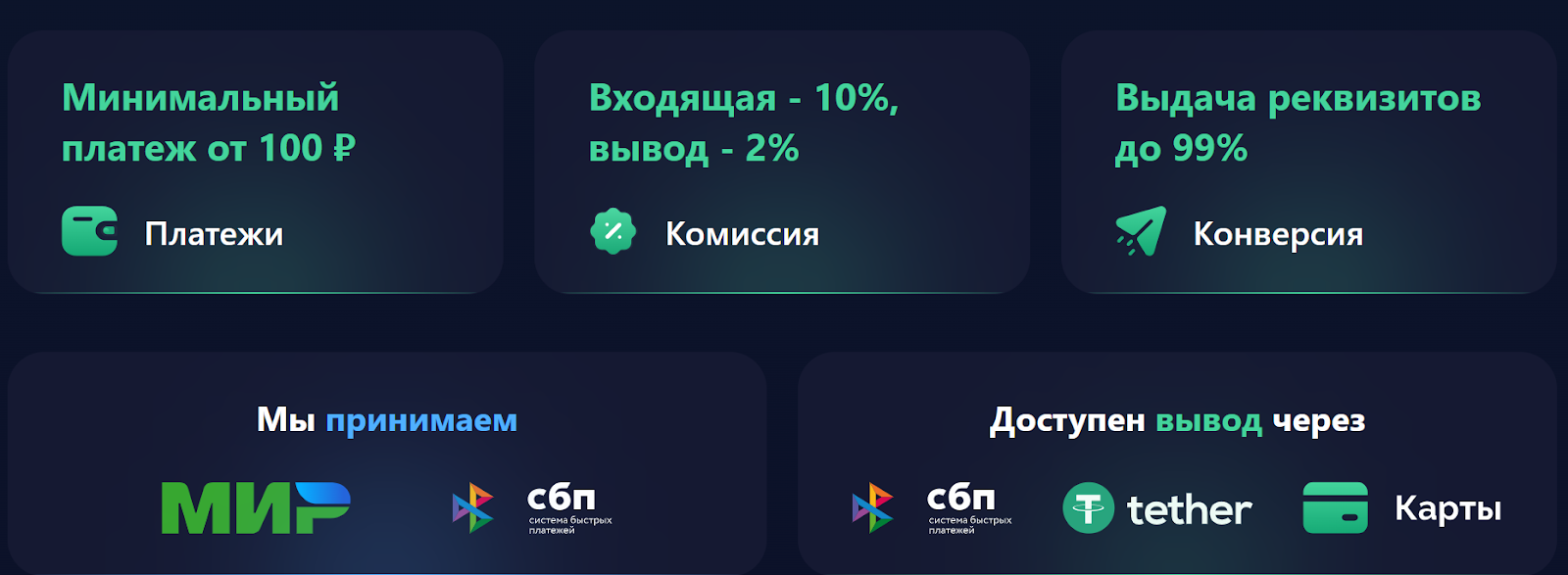 Система принимает платежи от ₽100. Размер входящей комиссии 10%, а на вывод 2%. К оплате принимаются банковские карты МИР, а также СБП. Вывод возможен теми же методами и в крипте. Процедура верификации занимает один час. За этого же время обещано и зачисление средств на баланс. Интуитивно понятное API и профессиональная поддержка якобы помогут легко интегрировать сервис в бизнес.