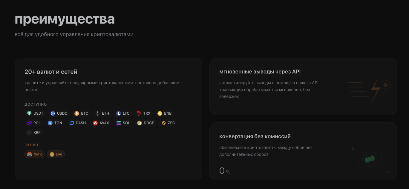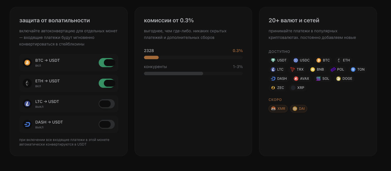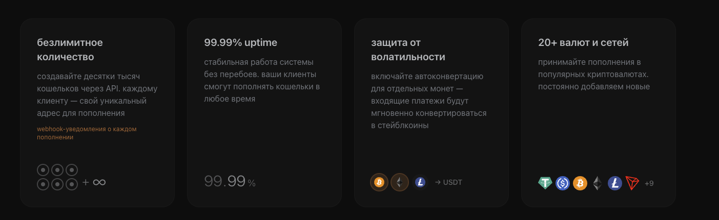На сайте платформы предлагается подключение приема платежей для бизнеса в криптовалюте. Пользователям обещают комиссии от 0,3%, но не указывают верхней границы комиссии.