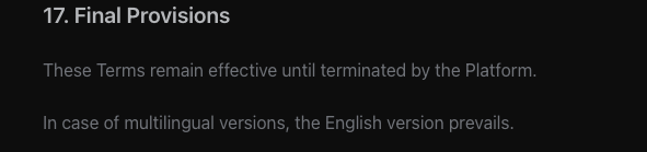 Хотя сайт доступен на русском языке, представители платформы тоже публикуют записи на форуме на русском – документы представлены только на английском. При этом в них не указывается полное наименование компании, а также сведений о том, в какой юрисдикции работает проект. Более того, в Правилах использования указано, что документ на английском языке является приоритетным. Таким образом может возникнуть двоякость трактовок текста при переводе на русский, что может привести к появлению разногласий.