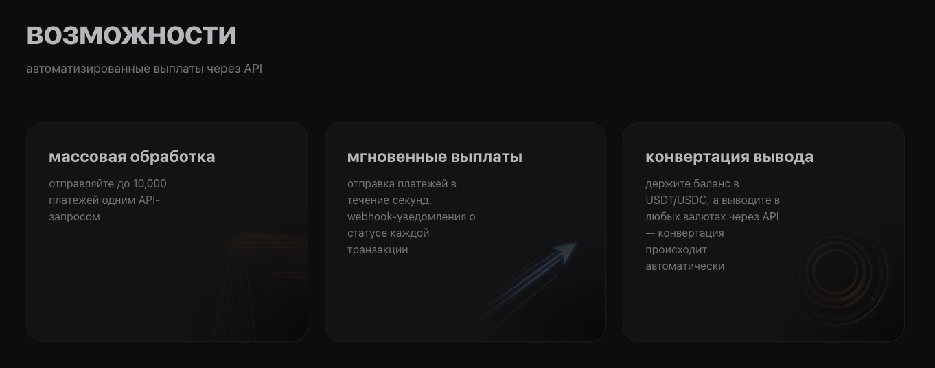 А также возможность интегрировать выплаты через АПИ: