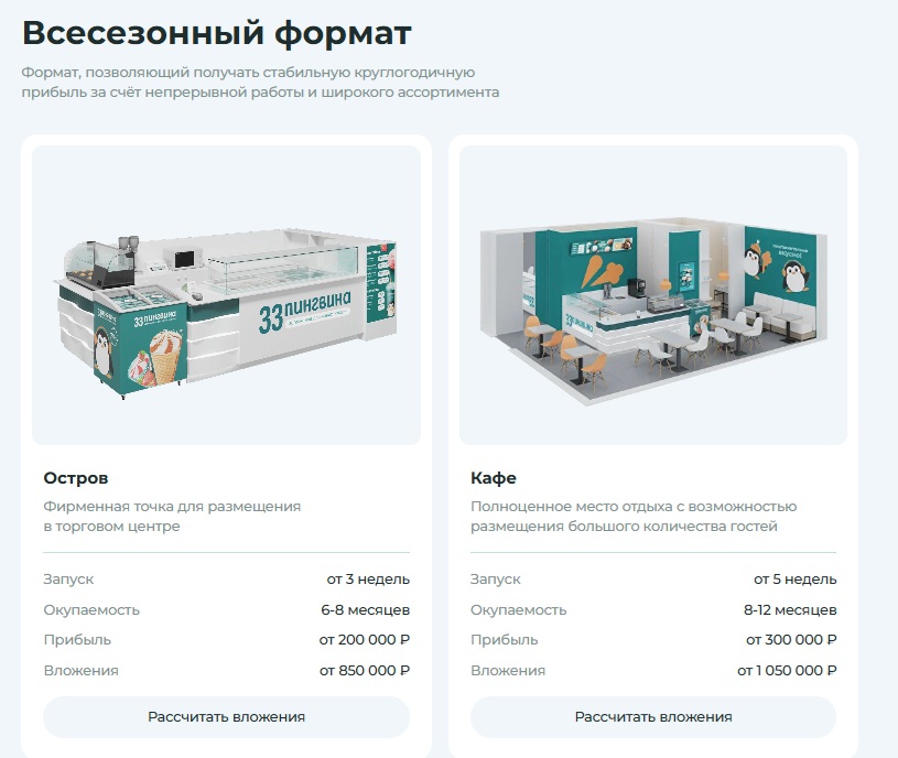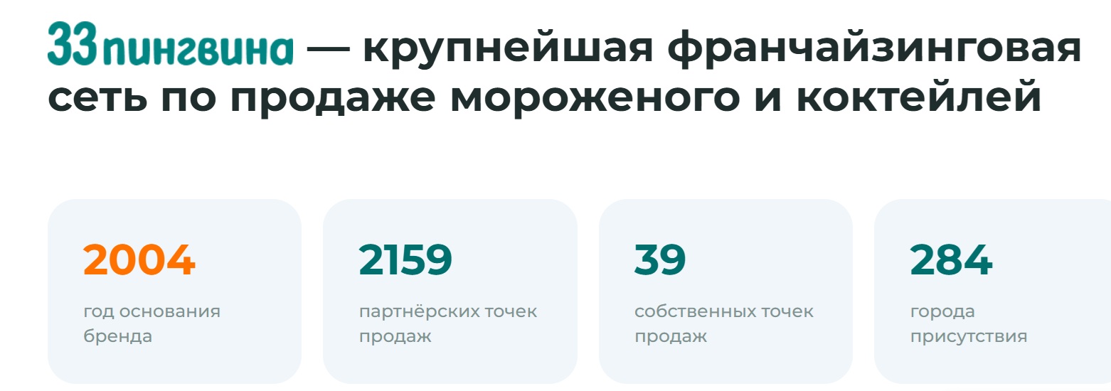 Сегодня у «33 пингвина» больше двух тысяч партнёрских точек и почти сорок собственных. Бренд работает в 284 городах. Авторы сами публикуют эти цифры и охотно ими делятся. Они называют себя надёжными партнёрами для новичков и обещают помогать на всех этапах.