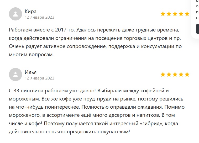 Кира начала работать с компанией в 2017 году. Она ценит, что её не оставляли без помощи даже в период ограничений для торговых центров. Ещё один партнёр Илья рассказывает, что долго сомневался между кофейней и мороженым, но выбрал «33 пингвина». Он не жалеет о решении, потому что большой выбор десертов и кофе в придачу к мороженому позволяет предложить клиентам то, чего нет у большинства конкурентов.