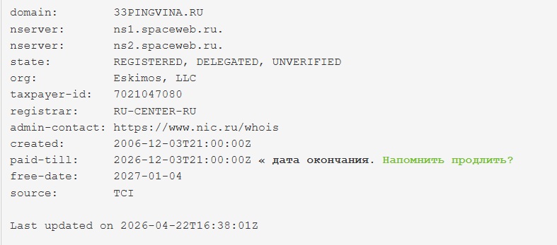 Проверка домена через WHOIS показывает, что сайт создан 3 декабря 2006 года. Это совпадает с заявлениями компании о старте франшизы. Домен работает почти 20 лет, организатор — Eskimos, LLC с ИНН 7021047080. С точки зрения возраста и юридической чистоты всё в порядке.