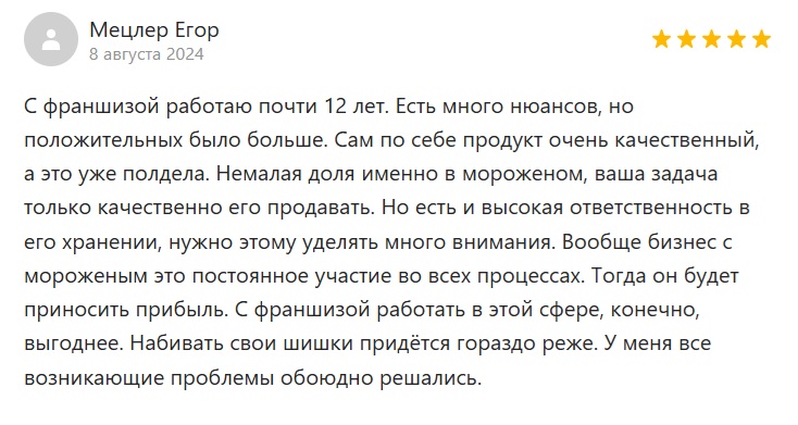 Франчайзи с двенадцатилетним стажем по имени Егор считает качество продукта главным плюсом сети. По его словам, это уже половина дела. Предпринимателю остаётся следить за условиями хранения мороженого и правильно выстраивать продажи. Егор подтверждает, что с готовой франшизой своих ошибок становится меньше, а все спорные моменты удавалось решать полюбовно.