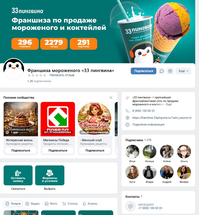 У бренда «33 пингвина» есть сообщество ВКонтакте примерно на 1 300 человек. Посты выходят редко, последние активные публикации были один-два года назад. Живых обсуждений почти нет, реакции единичные. Для сети с почти 2 300 точек это очень скромно.