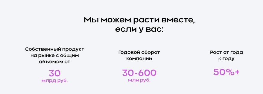 Основные критерии, по которым выбирают компании для инвестиций: ежегодный рост не менее чем на 50%, выручка свыше 150 млн рублей в год, эффективная бизнес модель, отличающаяся от конкурентов, построение бренда и качественный продукт (товар или услуга), открытость к новым формам продаж и активное привлечение аудитории.