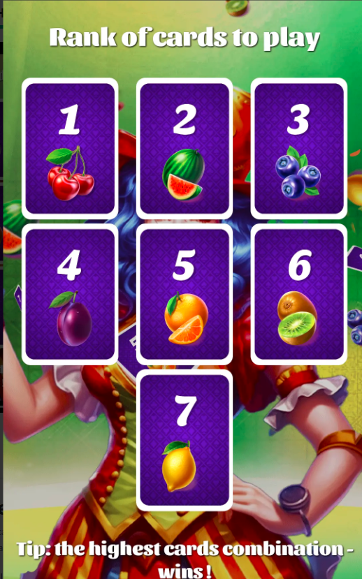 Механика построена очень просто. Игрок и его оппонент получают по две карты с фруктами — вишней, арбузом, черникой, лимоном, киви, апельсином и пр.