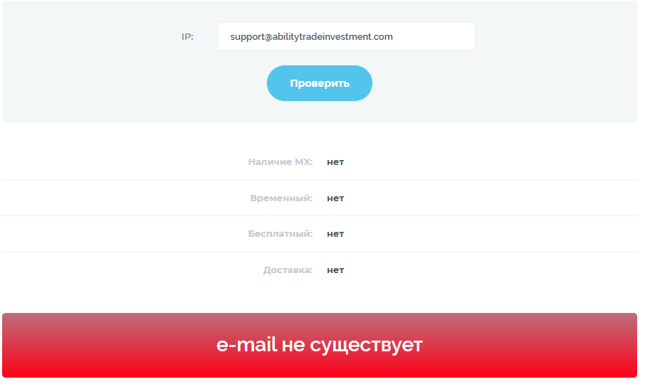 На сайте компании не было информации о лицензиях, даже сведений регистрации брокера. Брокерская компания не указывала юридический адрес и нормальные контактные данные. Единственный способ, с помощью которого можно было связаться с представителями сервиса – email support abilitytradeinvestment com. Только проверка показала, что он был просто несуществующим: