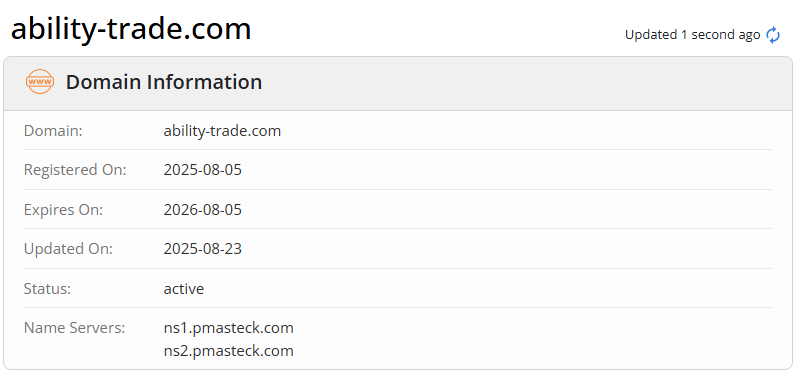 Домен сайта ability trade com был зарегистрирован только 5 августа 2025 года, а уже 23 августа сайт перестал работать: