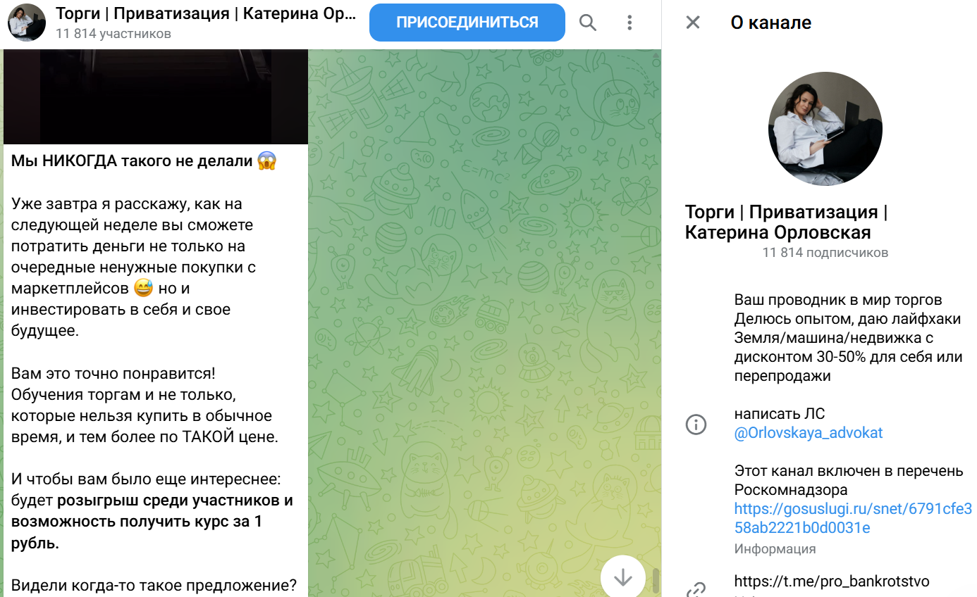 О себе Екатерина сообщает, что является юристом с опытом работы с 2003 года, а также выступает экспертом по торгам. В Telegram канале Торги Приватизация Екатерина Орловская состоится свыше 11 тыс. подписчиков. Аудитория подверглась накрутке, записи просматривают около полутора тысяч участников. Комментарии к постам оставляют единицы.