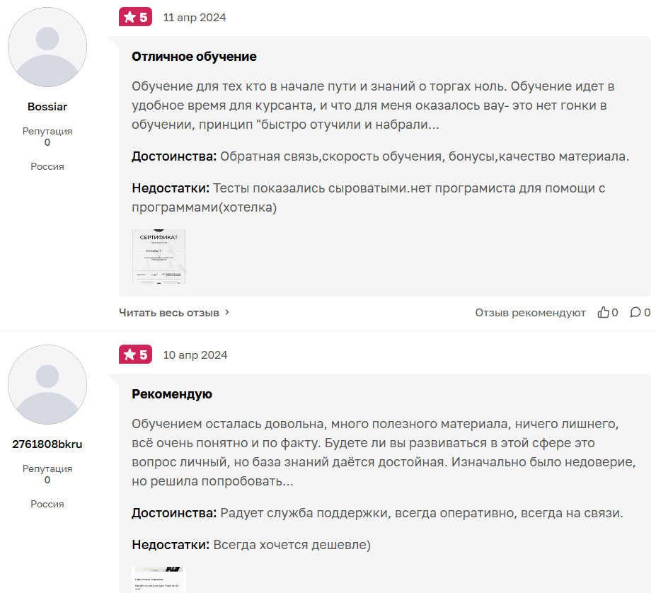 На площадке Отзовик положительные комментарии о курсе Торги как бизнес превалируют. Пользователи указывают доступность и структурированность материала, отмечают практическую направленность и высокий уровень обратной связи кураторов. Занятия школы проходят вечернее время, преподавателем является либо Катерина, либо кто-то из кураторов. По окончанию обучения высылают сертификат.