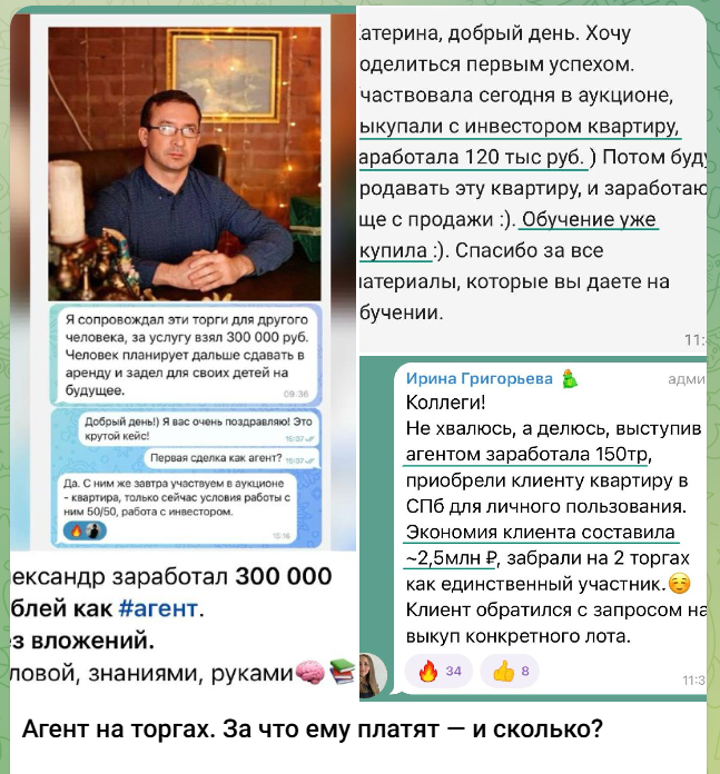 Заметим, что в описании карточки канала Екатерина презентует себя проводником мира торгов. В постах эксперт собирается делиться опытом, а также давать лайфхаки. Тематики записей затрагивают такие нюансы как сколько нужно средств чтобы принимать участие в торгах, какие вознаграждения зарабатывают агенты и т.д. Автор публикует переписки участников своей команды.