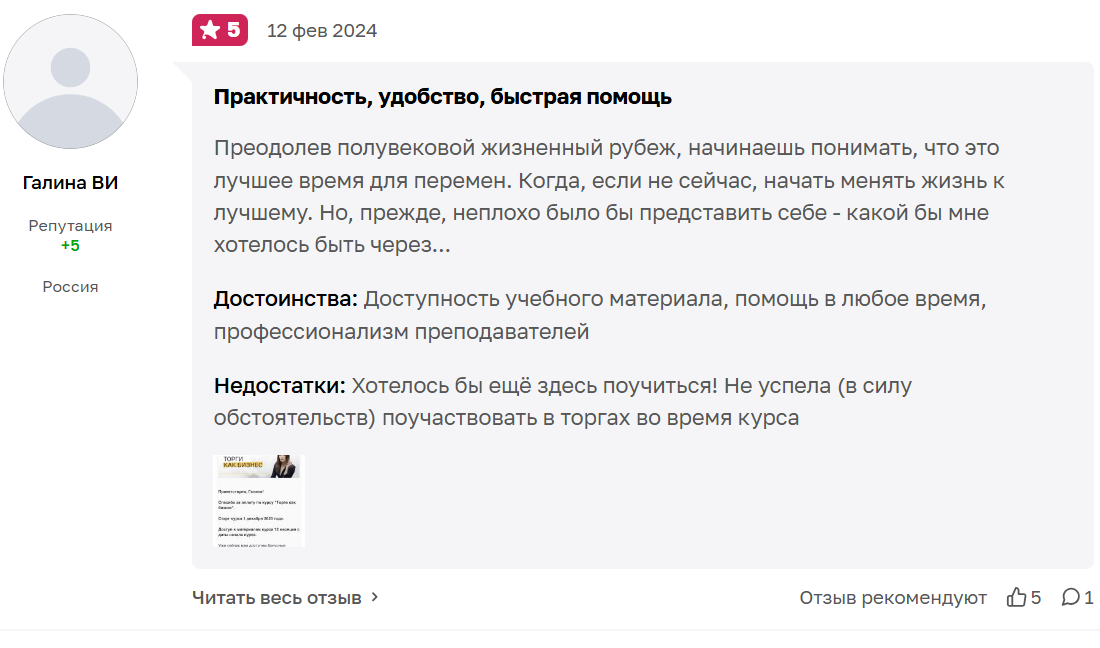 Очередная «экспертка» с курсами за баснословные деньги, обещающая золотые горы на торгах по банкротству. Отзывы пестрят разочарованием: материалы поверхностные, занятия в записи без обратной связи, а положительные комментарии выглядят как заказные. Похоже на очередной развод для доверчивых.