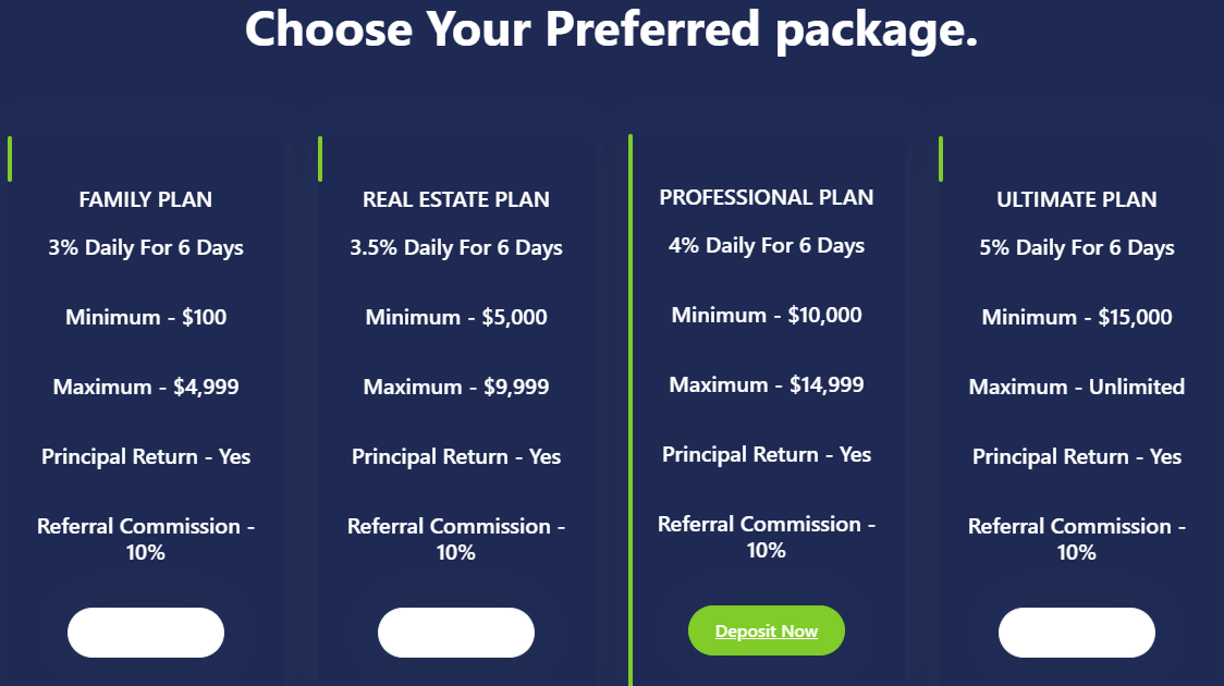 Минимально ACN Portforlio Ltd принимает $100, за которые клиент получает базовый план Family Plan с 3% ежедневной прибыли, депозит при этом замораживается на 6 дней. На максимальном плане Ultimate обещанная прибыль должна составить 5% в день, остальные условия такие же. Клиентам предлагают зарабатывать и без вложений: предусмотрена реферальная программа с отчислением в 10% от депозита привлеченного.