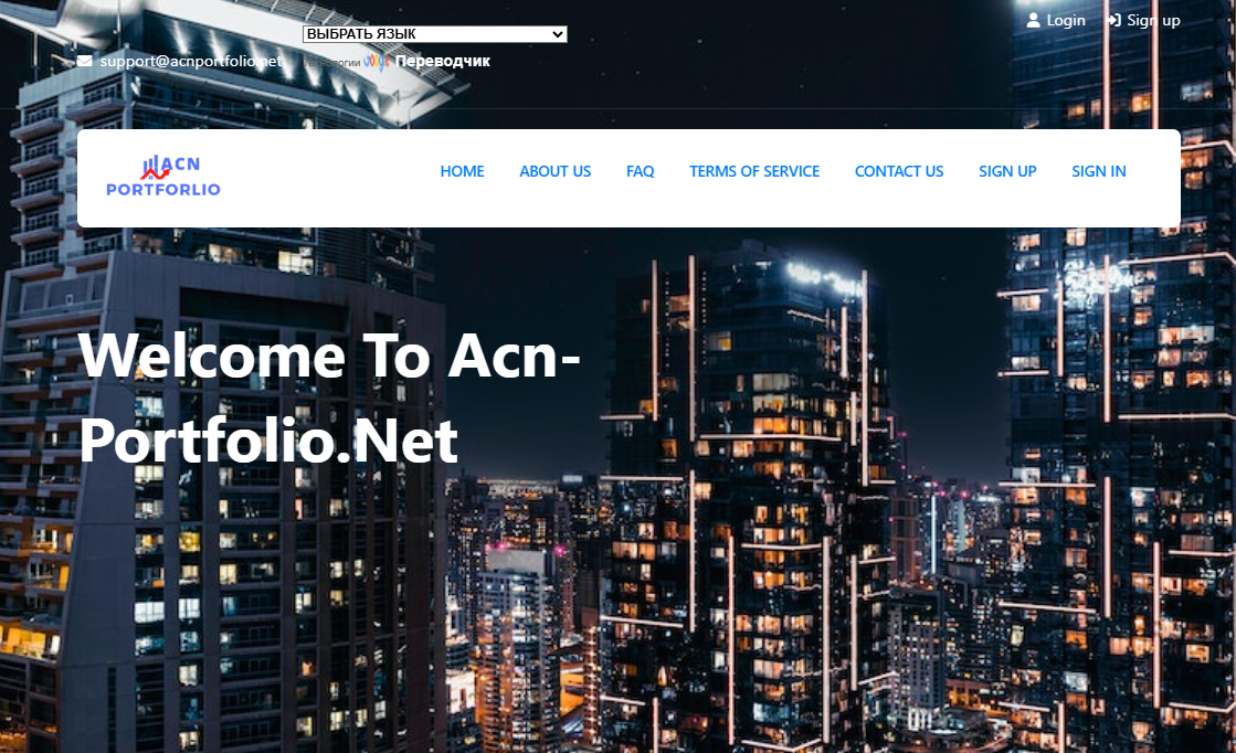 ACN Portfolio существует только в формате некачественного сайта, на котором клиент должен зарегистрироваться и сделать депозит в личном кабинете. Социальных сетей нет, а для связи у пользователей есть только адрес почты support acnportfolio net.