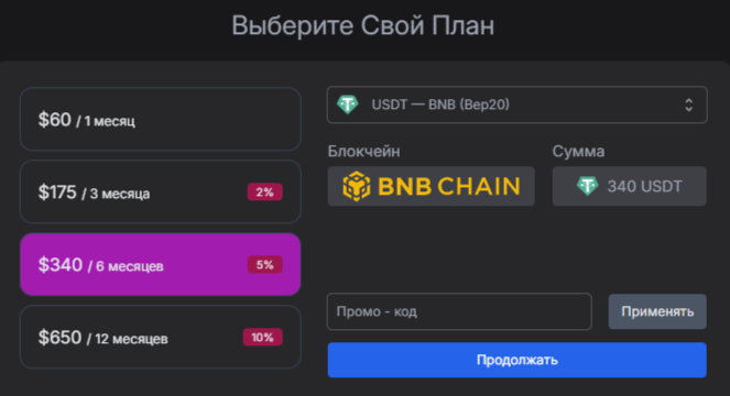 Оплатить любой пакет можно только криптовалютой. Такой способ внесения средств в большинстве случаев используют аферисты, ведь цифровую транзакцию отследить сложнее. В форму для выбора тарифа можно вписать промокод, если он есть. Эта опция является маркетинговым ходом аналитика. Видимо, он раздает бонусы своим клиентам и предлагает специальный код, который дает преимущества владельцу.