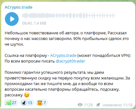 В ленте имеется закрепленный материал, в котором автор разместил звуковое сообщение, дал некоторую информацию о себе и своей деятельности. Он сообщает, что зовут его Иван, его опыт в трейдинге более 12 лет. Аналитик говорит, что смог разработать уникальную стратегию для извлечения профита на криптовалютных рынках. Вот только почему он только сейчас решил представить свои наработки широкому кругу лиц — непонятно.