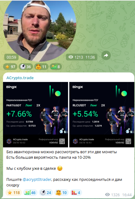 В звуковом сообщении автор сообщает, что все его торговые сигналы высокодоходные и проверенные. Он говорит, что работает с самыми популярными и высоколиквидными монетами: Биткоин, Эфириум, Солана и другие. Клиенты могут открывать по его сигналам долгосрочные и краткосрочные позиции.