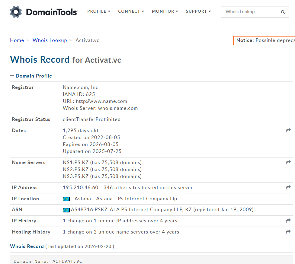По данным Whois сайт Activat Vc использует домен, который был зарегистрирован в августе 2022 года и на февраль 2026 года проекту четыре года. Хостинг в Казахстане, IP стабилен и почти не менялся, и к технической стороне ресурса вопросов нет.