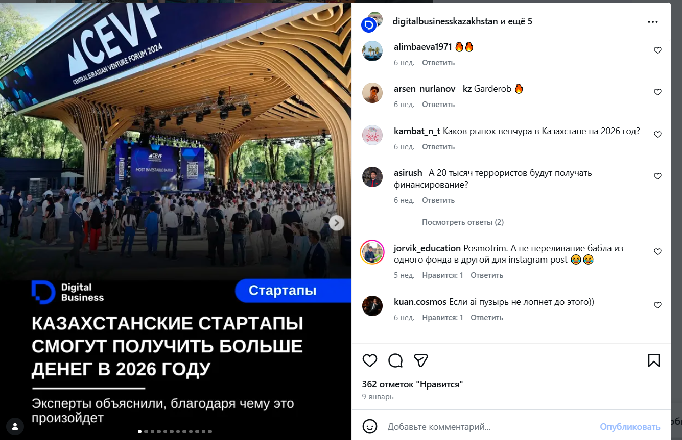 Единственное место, где есть отклики – это Instagram проекта, где люди обсуждают венчурный рынок, мероприятия и стартапы, задавая вопросы общего характера.