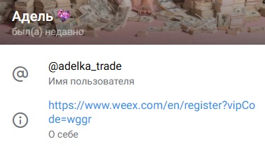 Необходимо отметить, что в профиле своего тг-аккаунта Адель опубликовала ссылку на криптовалютную биржу «Weex». По ее словам, она занимается торговлей и скальпингом исключительно на этой площадке.