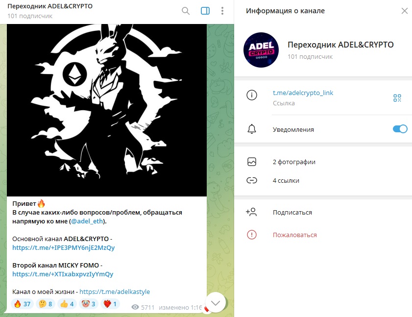 Часто паблик переводят в статус приватного, чтобы попасть на него используют бот-агрегатор Переходник ADEL&CRYPTO (@adelcrypto link). Кроме основного канала, там указаны ссылки на другие ресурсы автора.