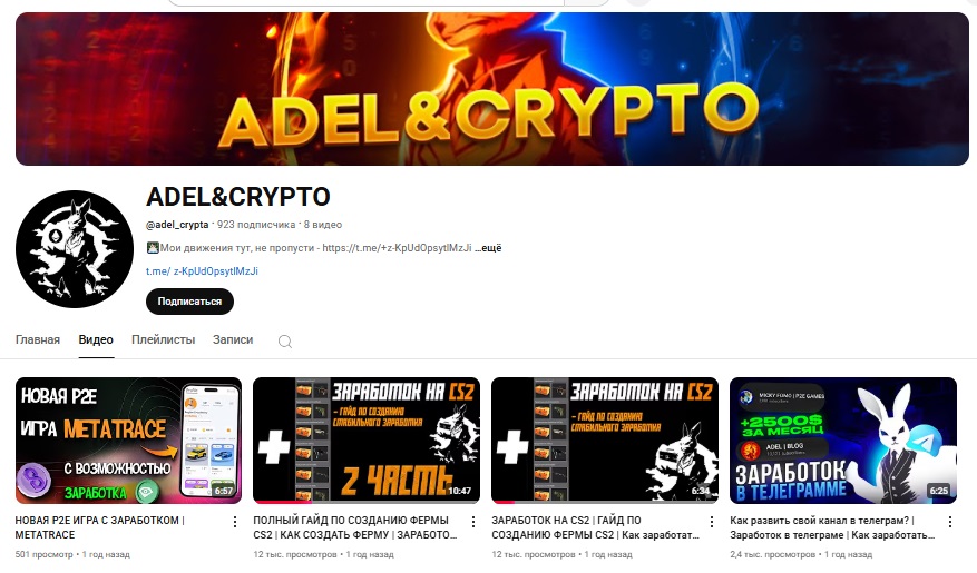 - YouTube-канал Adel Crypta (@adel_crypta) — 932 подписчика, опубликовано 8 роликов, количество их просмотров 31,7 тыс. раз. Контент: разбор криптопроектов, инструкции по заработку. Последняя активность отмечена более года назад.