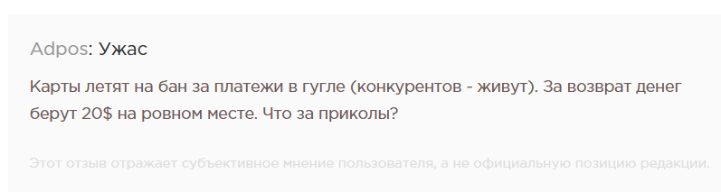Негативные отзывы тоже встречаются, причем в них говорят о блокировке за платежи в Google, а чтобы вернуть деньги, нужно заплатить $20.