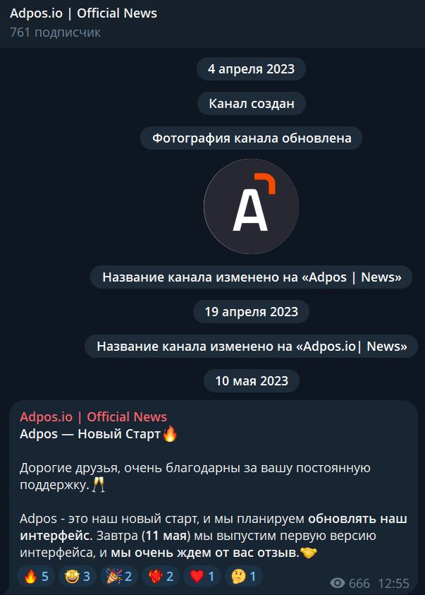 Такой факт указывает не только на продолжительный срок работы, но и стабильность, ведь условия не меняются уже несколько лет. Канал в Телеграмм «Adpos io | Official News» появился в апреле 2023 года, хотя посты там выходят редко, например, видно пробелы по несколько месяцев.