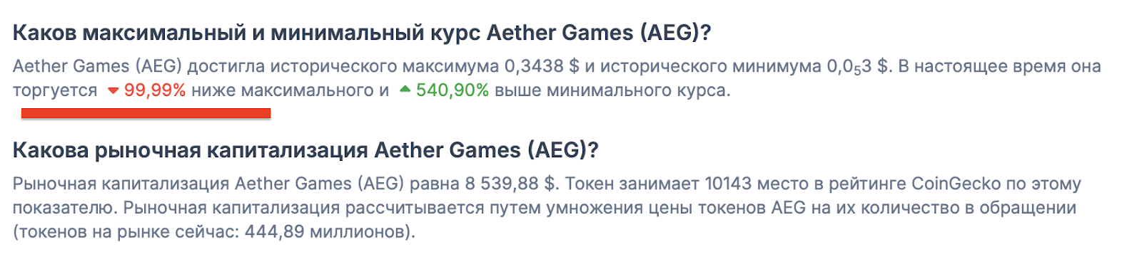 Если вы планировали инвестировать в AEG, лучше забудьте об этом. Токен едва держится на уровне долей цента, с капитализацией в районе $8 000. Это значит, что для ранних покупателей потери составили почти 100%, а почти отсутствующая ликвидность не позволяет продать токен даже «даром» из-за комиссий.