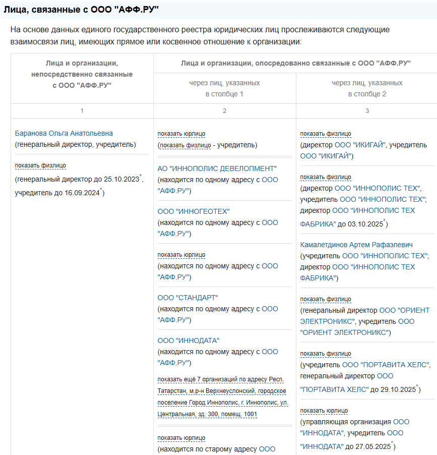 В открытых источниках указано, что ООО АФФ РУ связана по меньшей мере с 77 организациями.