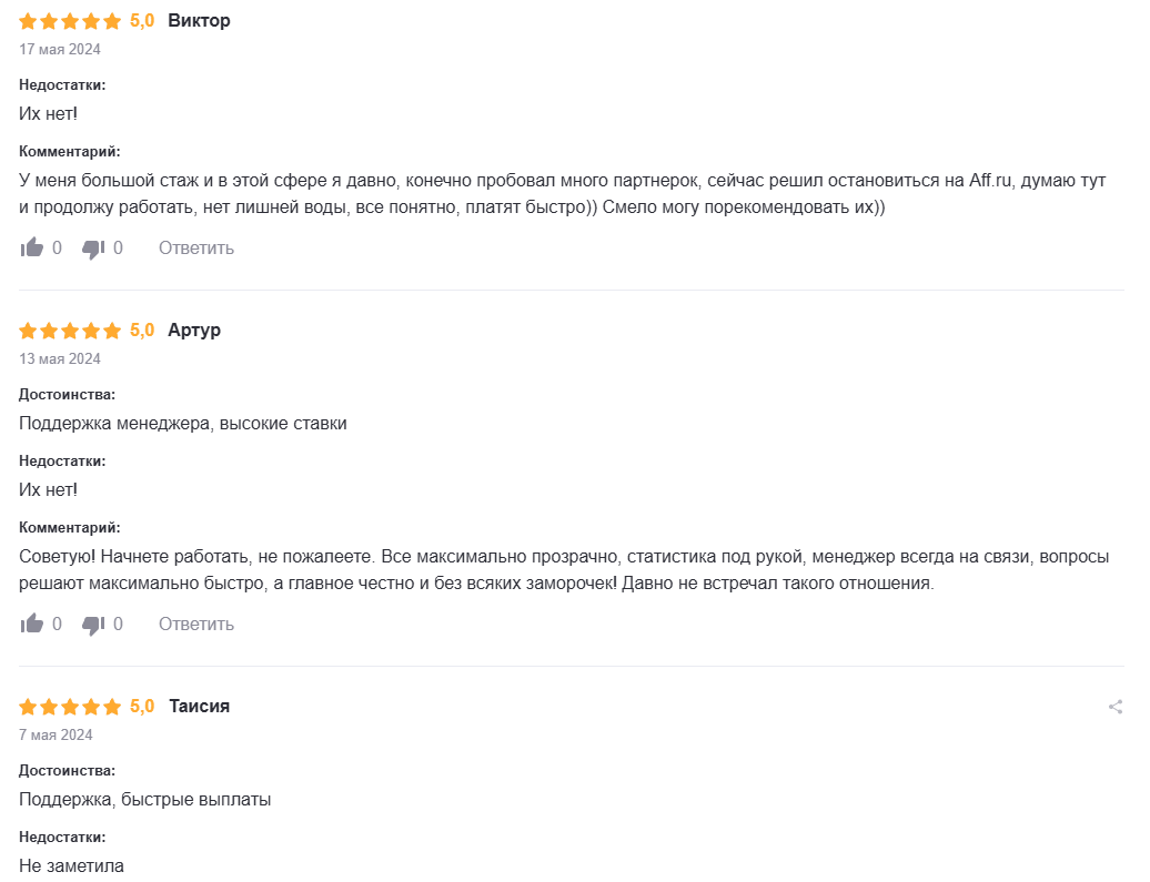 О сети Aff ru представлены отзывы на разных площадках. В основном все рецензии имеют положительный окрас, репутация организации положительная. В то же время не исключается возможность накрутки таких рецензий. На это может указывать загрузка сразу нескольких комментариев с небольшим перерывом.