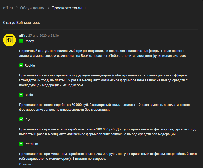 Всего в компании действует несколько статусов веб-мастера. В зависимости от данного статуса возможно рассматривать разные предложения с различным уровнем доходности.
