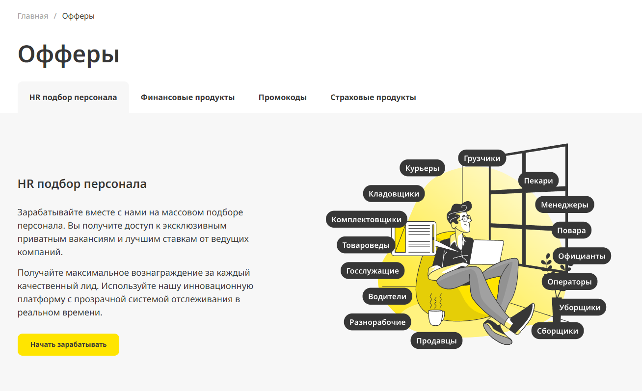 Пользователям предлагается зарабатывать на привлечении трафика, подборе персонала для различных компаний, продвижению страховых и финансовых продуктов, распространении промокодов. Все предложения представлены на сайте.