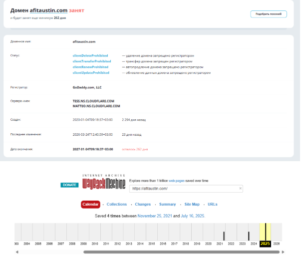 Далее мы обратили внимание на заявления о том, что компания Afitaustin com работает с 2017 года, поэтому открыли отчет Whois и узнали о регистрации домена в 2020 году. Даты не сходятся, но и это еще не весь подвох, поскольку в архивах не отражается деятельность этого проекта, а последнее изменение с «участием» этого адреса произошло в марте 2026 года.