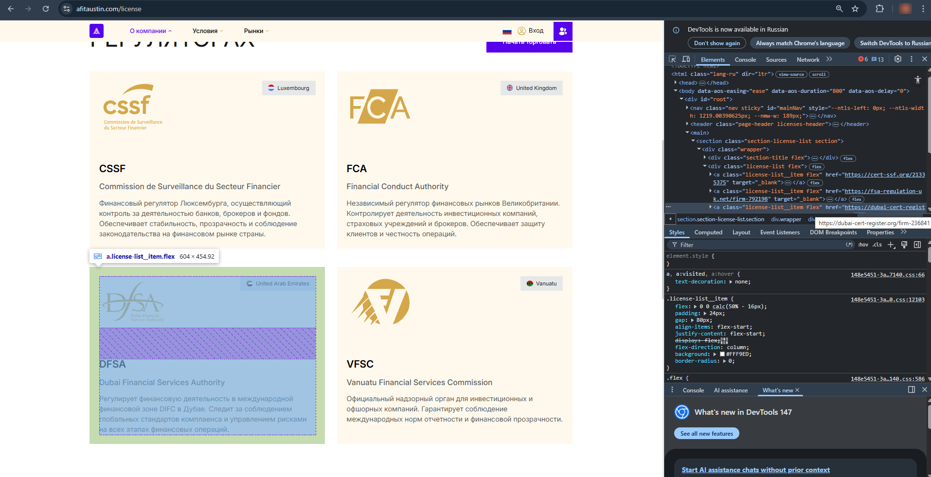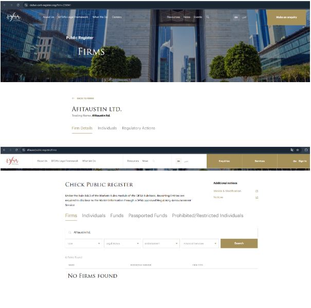 В реальности же ситуация куда более запутанная, так как пользователя перенаправляют на фейковые страницы регуляторов, где якобы указана запись о брокере. Например, портал dubai-cert-register org является полной копией сайта dfsa ae, имеющего отношение к надзорному органу Дубая. Разница лишь в том, что в настоящей базе DFSA нет никакой информации об Afitaustin com, поэтому можно сделать вывод о нелегальной работе брокера в этом регионе.