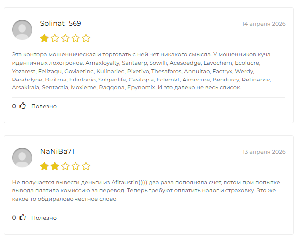 - В отзывах об Afita Ustin встречаются только обвинения в мошенничестве, что говорит о недовольстве клиентов и потерянных ими инвестициях.