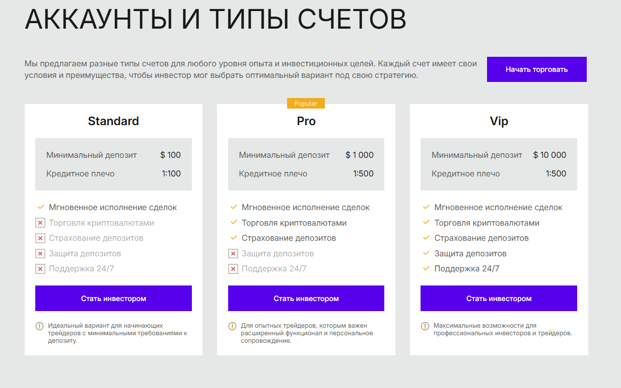 Например, при внесении средств на сумму от $100, пользователь открывает стандартный аккаунт с возможностью мгновенного исполнения сделок и кредитным плечом 1 к 100. Профессиональный и премиальный счета подразумевают пополнение на $1,000 или $10,000, но предлагают расширенный лимит, а также возможность торговать криптовалютами и страхование депозитов.