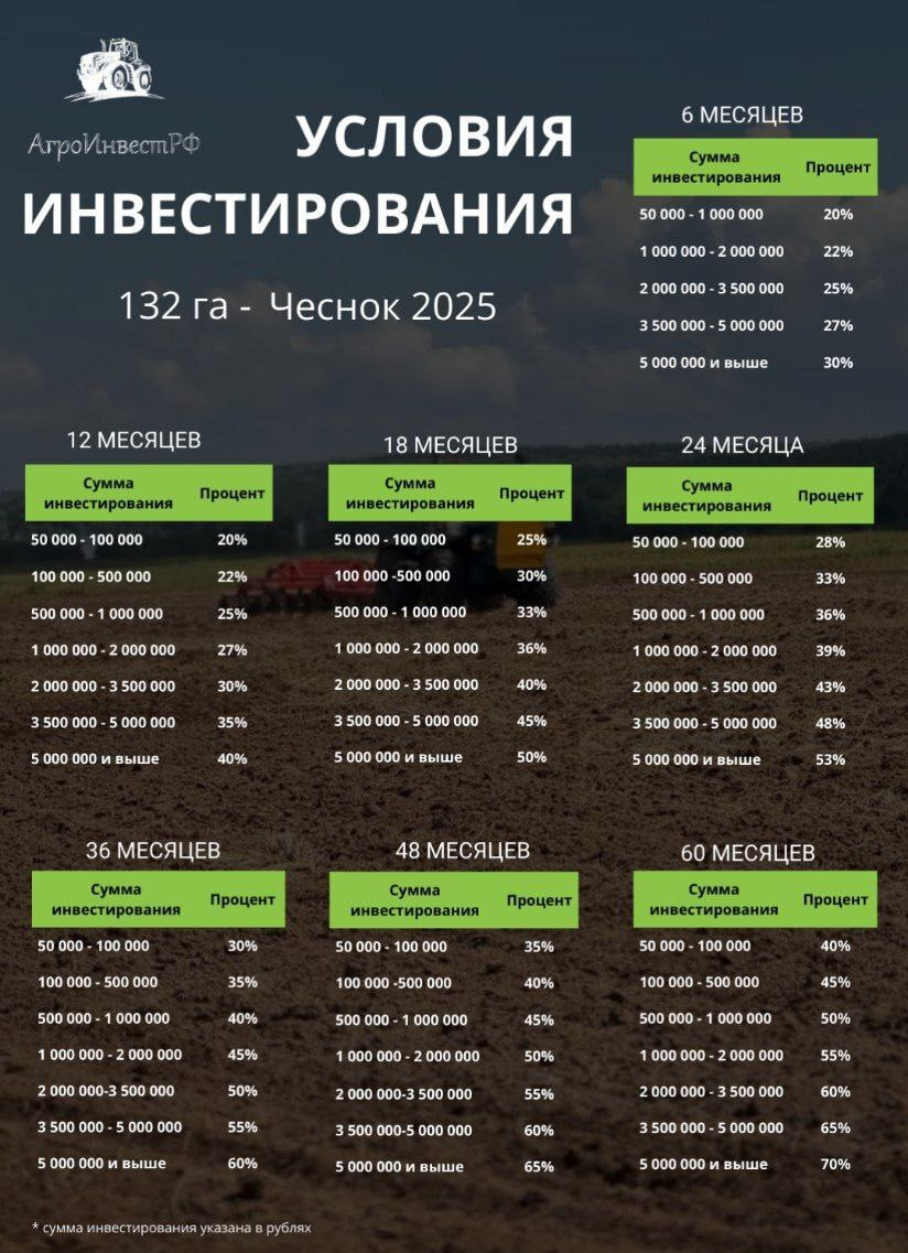 Схема работы — займ под процент. Инвесторы передают деньги КФХ по договору займа, средства идут на развитие производства чеснока. Минимальная сумма от 50 000 рублей, срок от 6 месяцев до 5 лет.