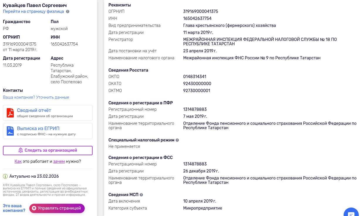 КФХ Кувайцев Павел Сергеевич зарегистрировано 11 марта 2019 года и по-прежнему числится действующим. Домен agroinvestrf ru зарегистрирован в 2023 году на частное лицо со скрытыми данными. Налоговая отчетность по данным публичного сервиса ФНС не найдена — на это прямо указывает запись на сайте самого проекта в разделе про риски. Это существенный момент для тех, кто рассматривает проект как объект для займа.