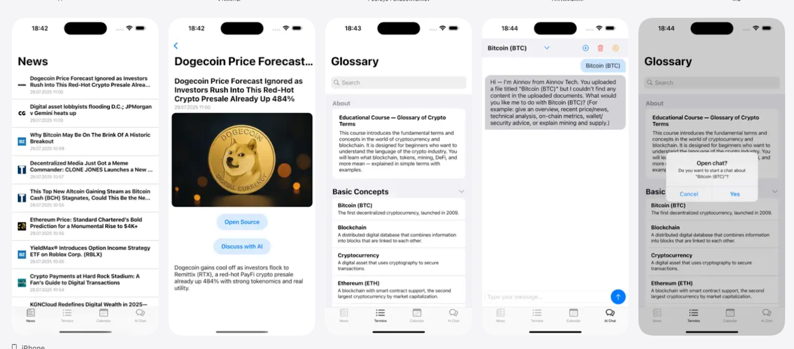 Компания Ainnov называет себя независимым образовательным проектом. Цель данной площадки – помочь обычным людям лучше понимать криптовалюты и вообще эту сферу. Платформа существует в формате интернет-ресурса. Сайт не адаптирован под компьютер, нормально он открывается только в мобильной версии. Также у проекта есть мобильное приложение, разработанное Peeraya Pakdeewilaikiet – частным независимым разработчиком, сфера интересов которого сосредоточена на образовательных проектах. Приложение представляет собой утилиту, которая содержит множество полезных терминов и технологий работы с криптовалютами. В нем есть самый настоящий Глоссарий, который дает простые объяснения сложным терминам. Программа подходит для трейдеров любого уровня.
