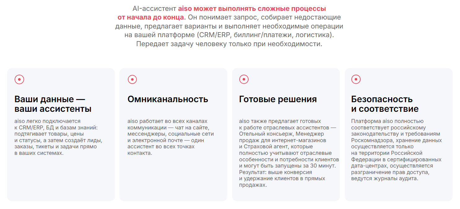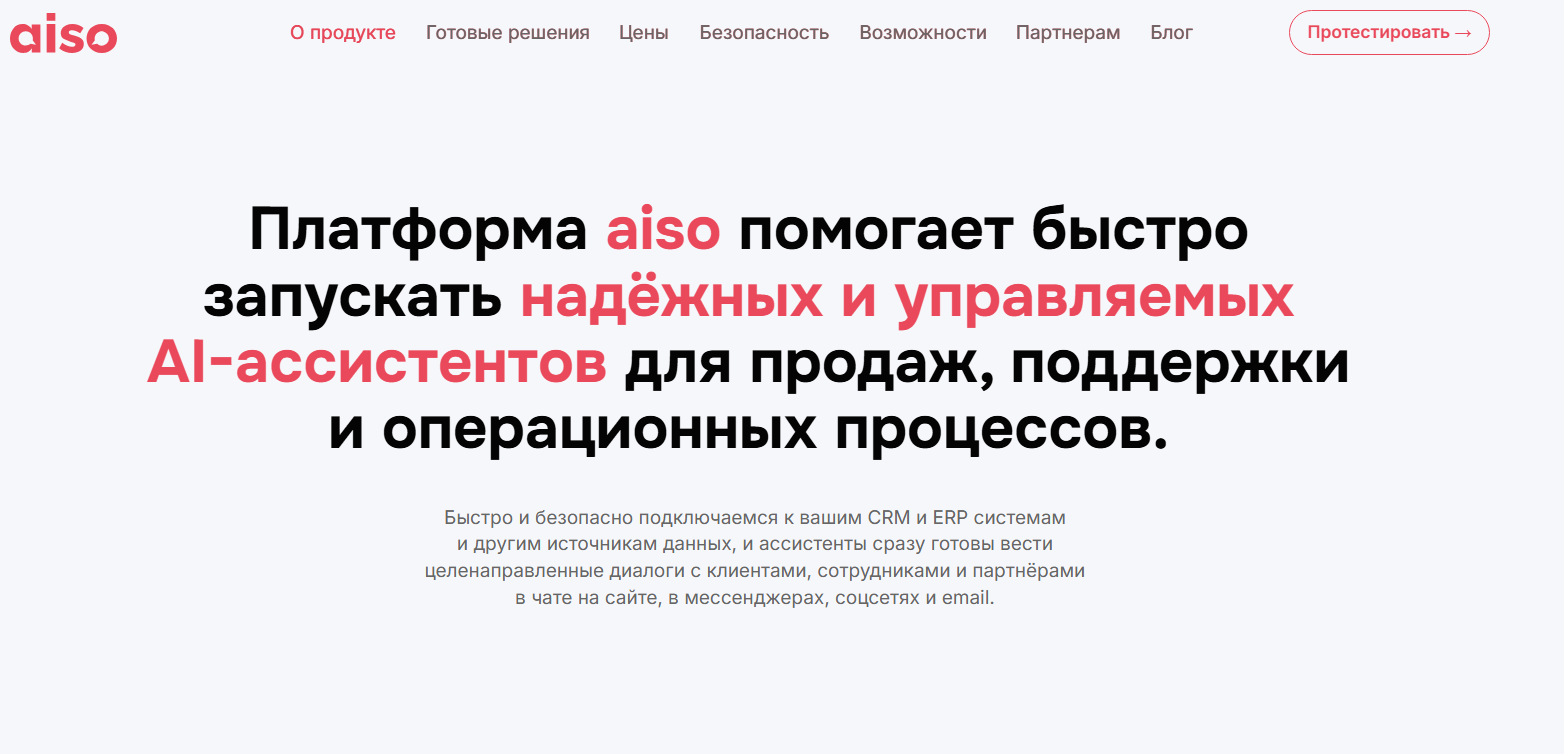 Aiso – платформа для подключения ИИ-ассистентов к сайтам и соцсетям магазинов, отелей, ресторанов. Разработана российской компанией. Подробнее расскажем далее.