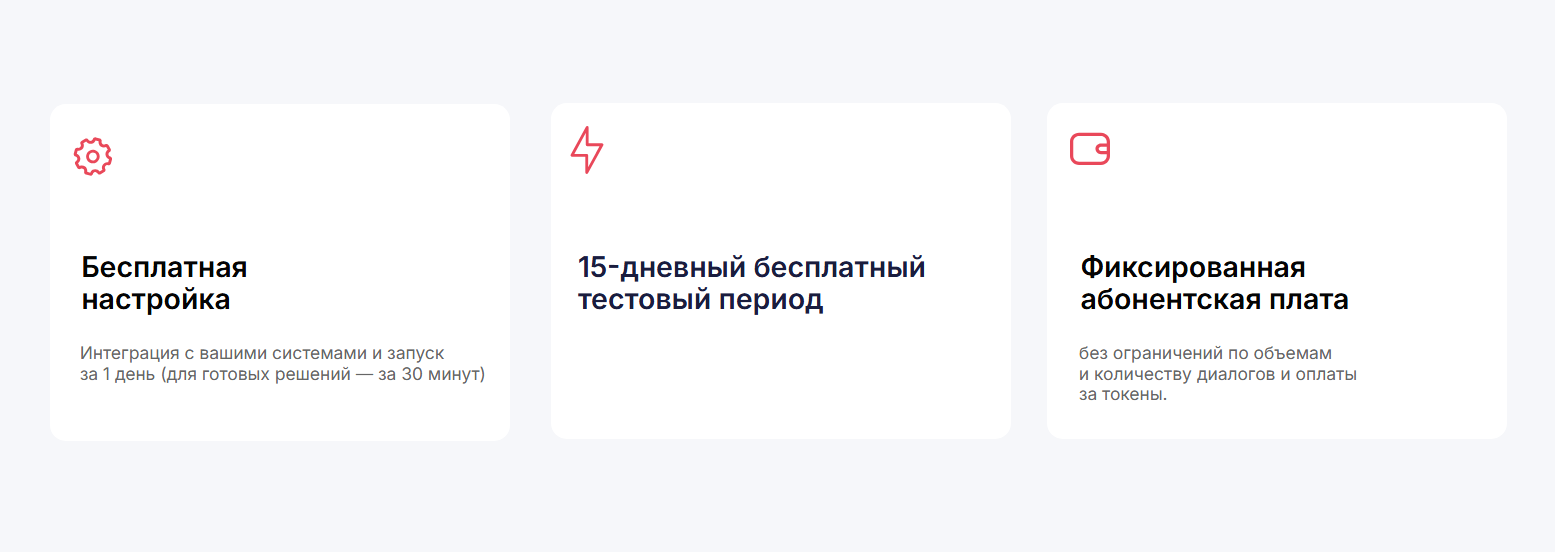 В любой момент бот может передать диалог живому человеку для более развернутой консультации. Цены на ИИ-ассистентов на сайте не указаны.