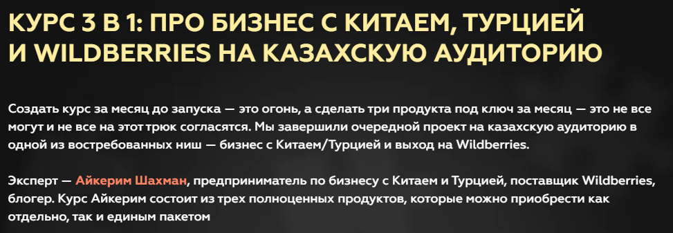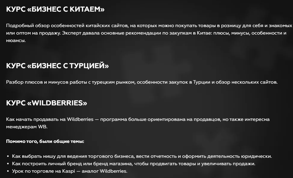 На сайте есть описание курсов Айкерим Шахман, но оно выглядит неконкретным. «Эксперт» обещает сделать обзор китайских сайтов, на которых продавец может закупать товары, а также рассказать о плюсах и минусах турецкого рынка. Скорее всего, такую информацию легко найти в открытом доступе бесплатно.