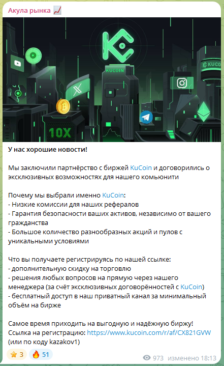 Одной из площадок, рекламируемых пользователем с никнеймом Moder Mk, является сервис «КуКоин». Организатор тг-клуба Kazakovinvest тем, кто зарегистрируется по предоставленной им ссылке на торговом ресурсе, обещает обеспечить бесплатный доступ в приватное сообщество и применить к сделкам пользователей скидки на торговлю. В закрытой группе опытный трейдер Maxim Kilov обучает выходить в плюс и грамотно пользоваться торговыми роботами.