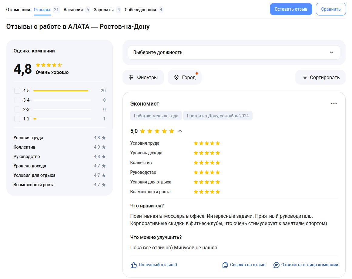 Хоть это не именно отзывы инвесторов на Алата Гарант, обратим внимание на мнения сотрудников компании, оставленные на сайте Dream Job. Они подтверждают, что организация действительно работает в области недвижимости в Ростовской области и имеет немало сотрудников.