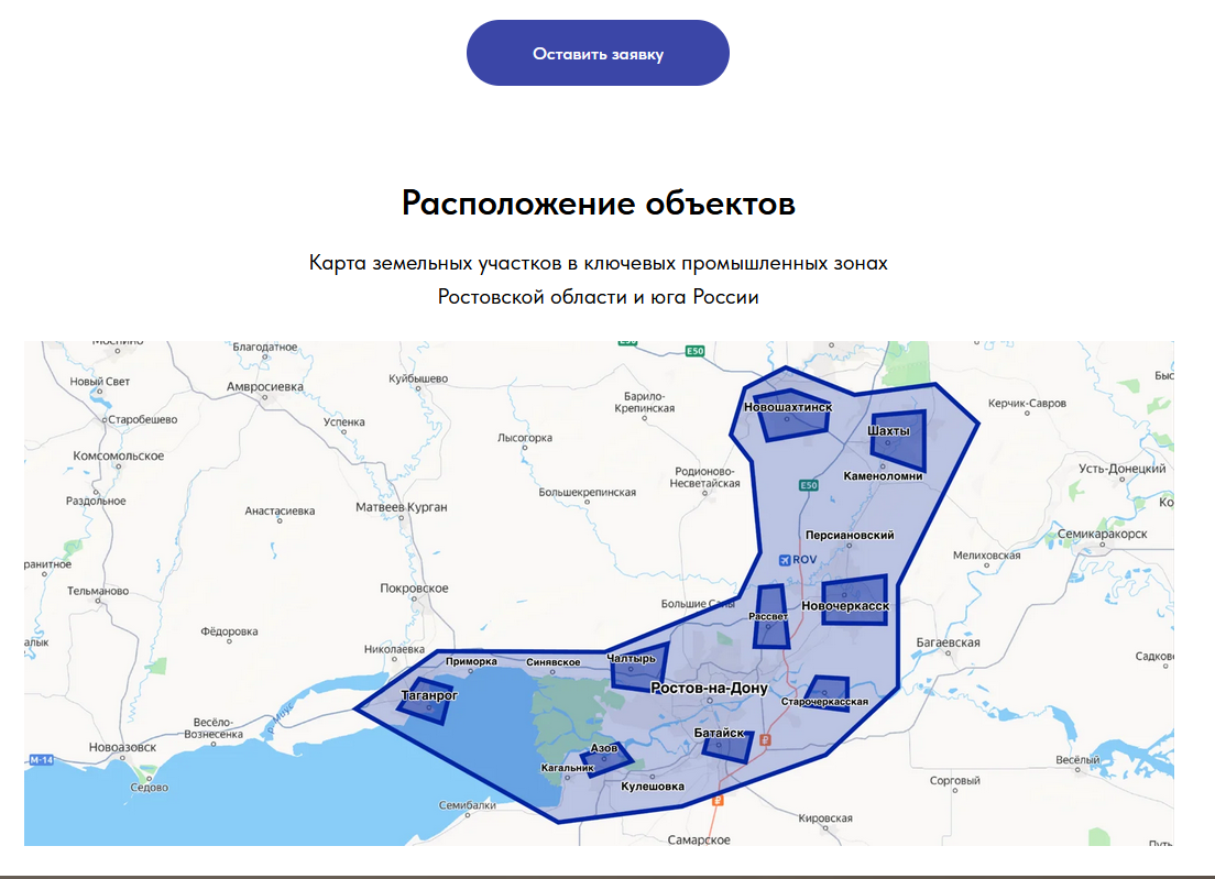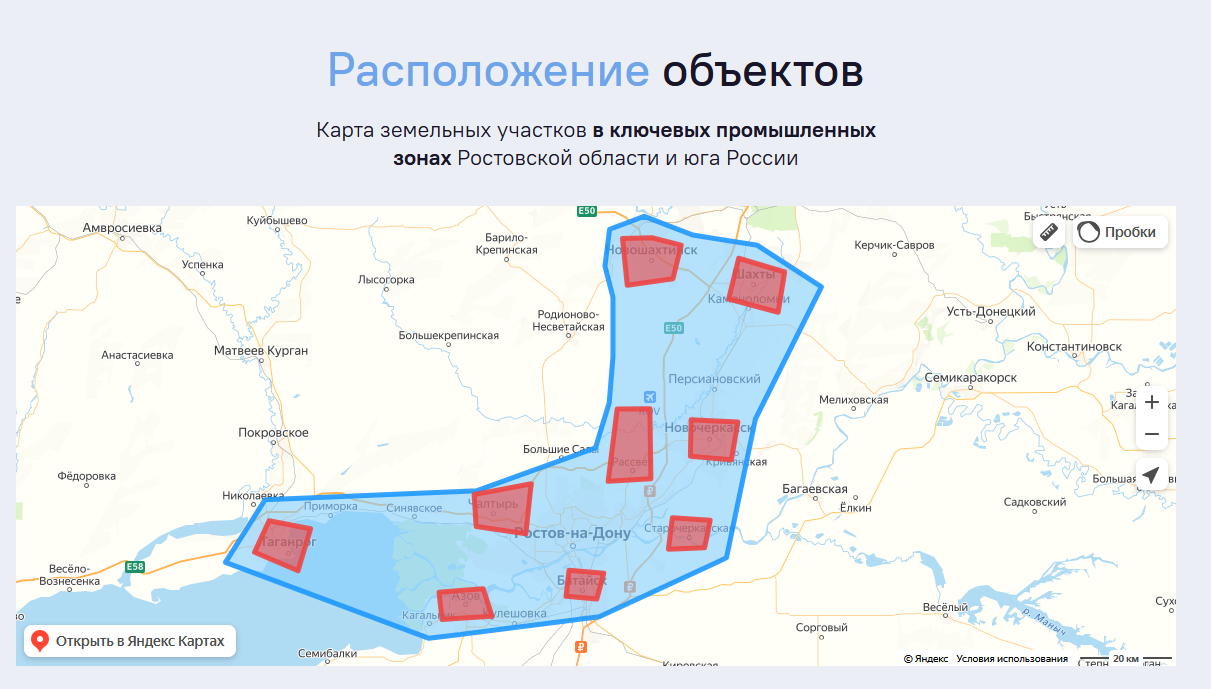 На отдельной странице предлагается каталог объектов для недвижимости. Все они расположены на юге России преимущественно в Ростовской области. Связи с Краснодарским краем, где по заявлениям компании находится ее офис, нет.