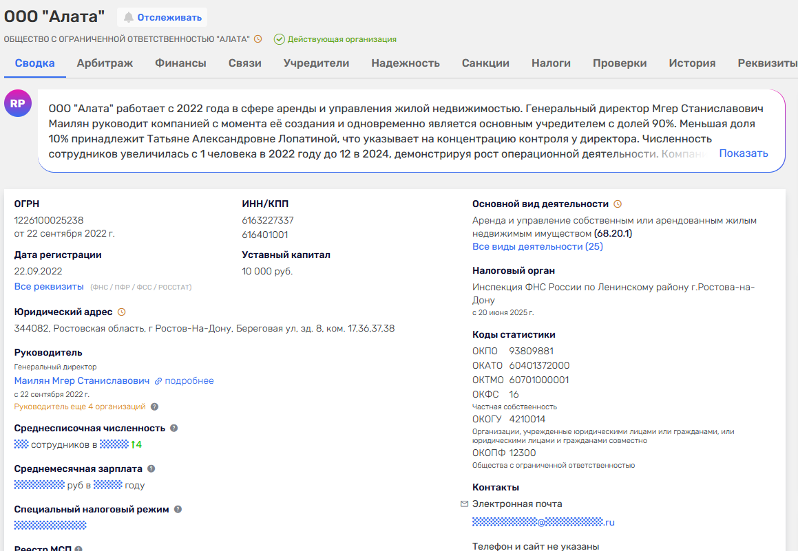 В госреестре действительно есть зарегистрированное на него с 2022 года ООО «Алата» в Ростове-на-Дону. Вид деятельности совпадает с тем, что на сайте, а также есть статус действующей организации. Но 2022 год регистрации тоже не совпадает с заявлением об опыте компании на сайте.